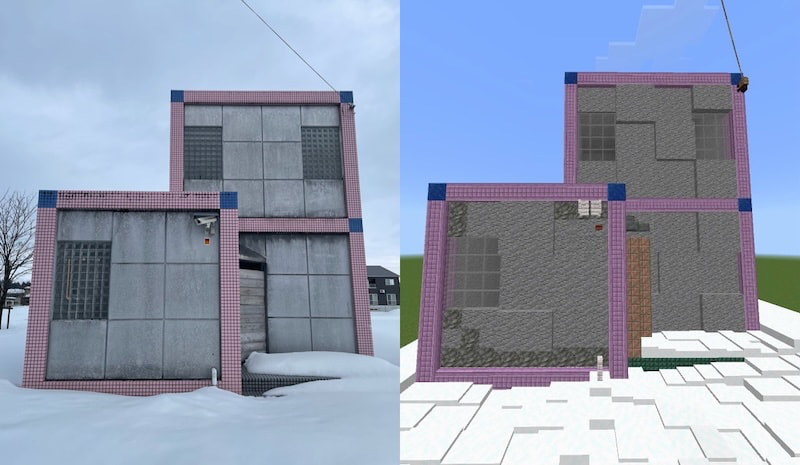 マイクラに話を戻すと、町でマイクラっぽい物を見かければ再現してみたくもなる。前に住んでいた町には極めてマイクラっぽい建物があって、それを作ってみたこともある。xにも投稿したことがあるものだが、こちらの建物である。ピンクの部分がすごくプルプァっぽいでしょう?